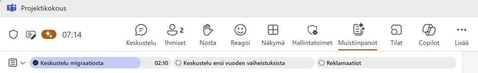 Liittyessä kokoukseen, agendan mukainen esityslista tulee näkyviin. Kun aloitat kokouksen samaan aikaan kun mitä kutsuun on merkattu, näet reaaliaikaisesti kuinka paljon aikaa on kyseiseen osaan jäljellä.