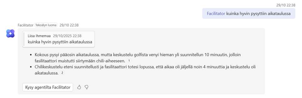 Facilitatoria voit kutsua kokouksen chatissa myös @Facilitator -maininnalla. Voit esimerkiksi käskyttää Facilitattoria laittamaan ajastimen käyntiin. Mielikuvitukseni antaa hyvin tilaa sille, että Facilitator voisi tulevaisuudessa ottaa vielä vähän isompaakin roolia. Ehkä jopa puheella fasilitoida kokousta. Faciltatorilta voi myös kysellä kokoukseen liittyvistä asioista ja tässä se menee aika lähelle kokouksen Copilot -toimintoa.