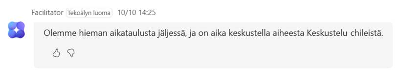 Facilitator muistuttelee kokouksen etenemisestä myös kokouksen keskustelun puolella. Sinne tulee mainintaa mitä on käsitelty, milloin on aika siirtyä seuraavaan aiheeseen, milloin ollaan aikataulusta jäljessä ja niin edelleen. Mielestäni Facilitator on ehkä hieman liian kaino fasilitoinnissa. Kokouksen chat jää helposti näkemättä. Ja vaikka keskustelisit jostain aiheesta enemmän kuin mitä aikaa on varattu, ei Facilitator komenna sinua takaisin ruotuun.