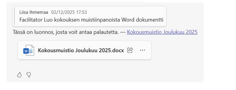 Kokouksen päätteeksi voit keskustelun puolella pyytää Facilitatoria vielä luomaan kokouksen muistiinpanoista Word dokumentin. Dokumentti tallentuu automaattisesti OneDriveesi. (Wordin luominen ei välttämättä toimi vielä kaikilla)