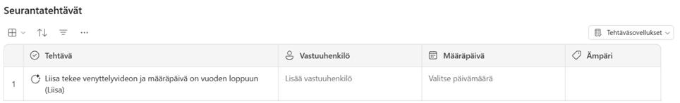 Kokouksen muistiinpanoissa on alimmaisena kohta Seurantatehtäville. Facilitator tunnistaa kokouksessa tehtäviä ja asettaa niitä Seurantatehtäviin. Toistaiseksi se ei pysty määrittelemään deadlinea eikä vastuuhenkilöä. Kun seurantatehtävä saa manuaalisesti deadlinen ja vastuuhenkilön, se siirtyy automaattisesti vastuuhenkilön To Do:hun.