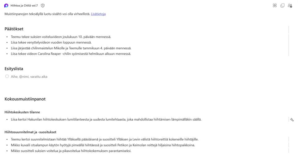 Facilitatorin voit kytkeä myös kokousasetuksista päälle. Facilitatorin yksi päätehtävistä on tehdä kokouksestasi muistiinpanot. Tähän se käyttää Teams-kokouksen mukana tulevaa Kokouksen muistiinpanot -Loop-sivua.